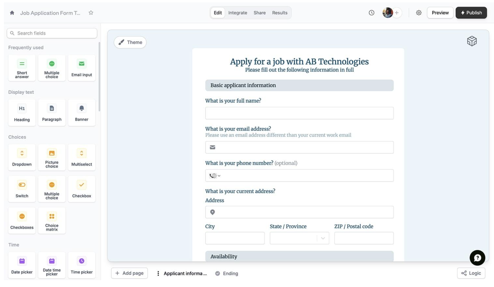 It has an AI form generator to create a form from text, files, and other form URLs. It also offers many other powerful features that make it the all-rounder we talk about, such as advanced conditional logic, auto-response emails, auto-scoring, custom domain, file uploads, custom PDF generation from submissions, and more. forms.app offers both classic list view form layout and conversational step-by-step layout. forms.app stands out as an easy-to-use form builder that offers the best value overall.