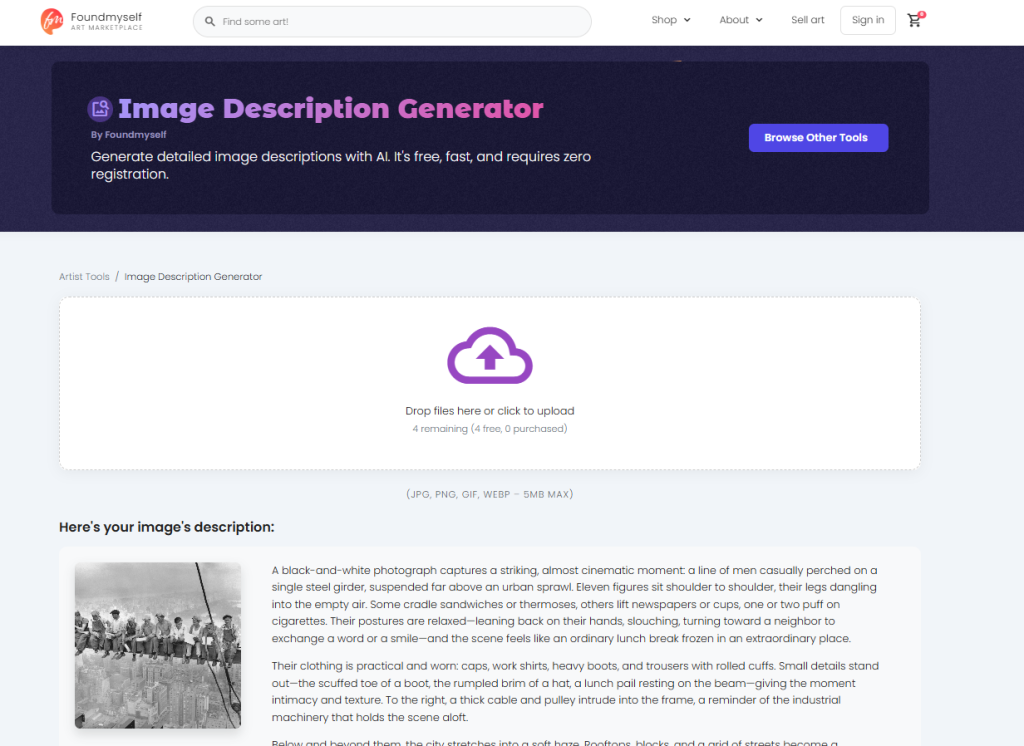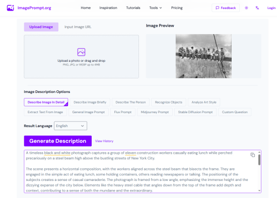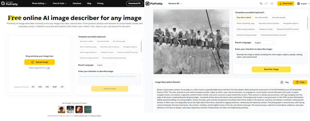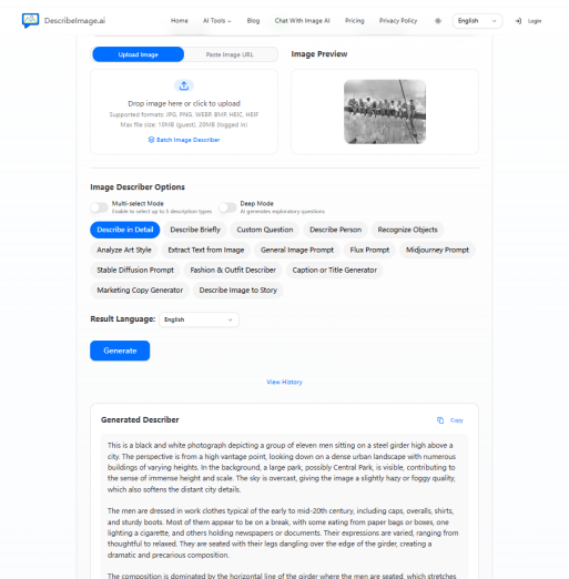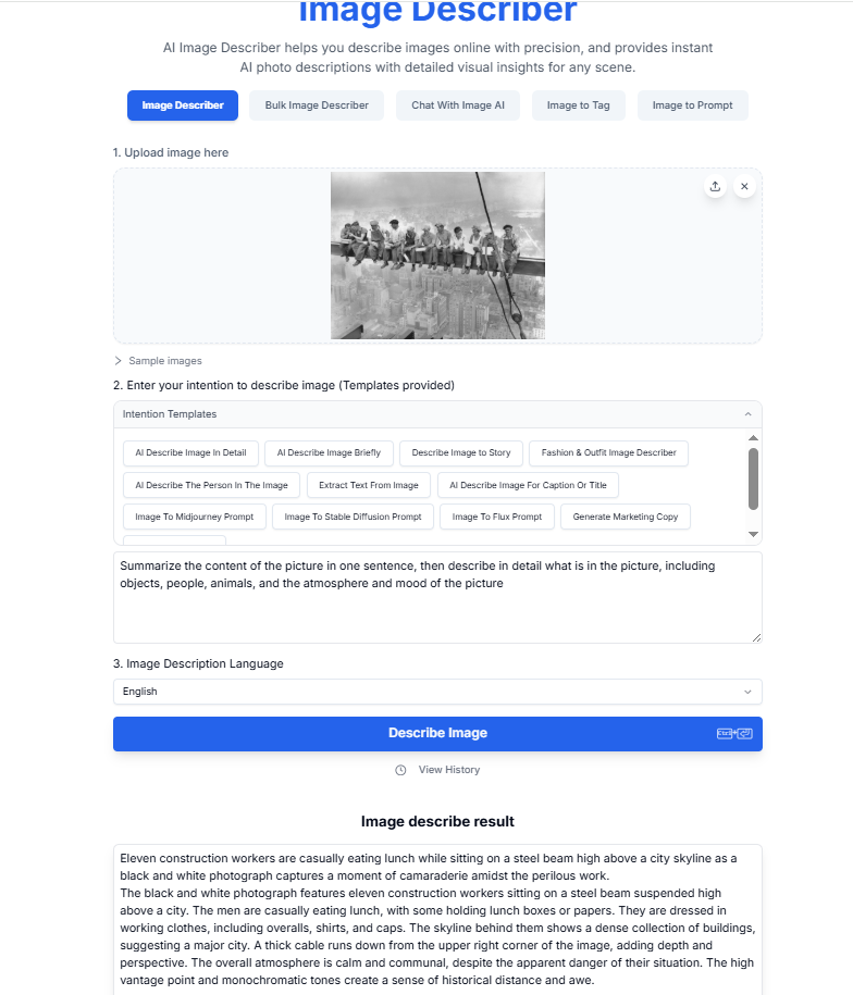 In order to test the best AI image description generator in 2026, we used a single iconic historical photo: Lunch Atop a Skyscraper (1932). This image is widely recognized, visually complex, and rich in historical context, making it an ideal test case for evaluating image-to-text accuracy.