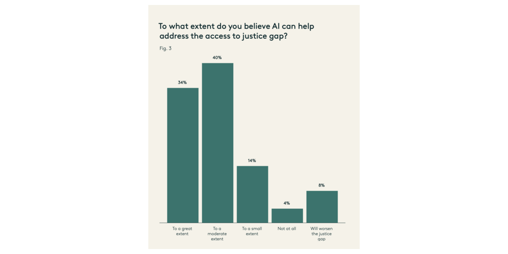 - 88% of respondents believe AI can help address the access to justice gap to some extent. This widespread optimism underscores the potential for AI to create a more equitable legal system.
