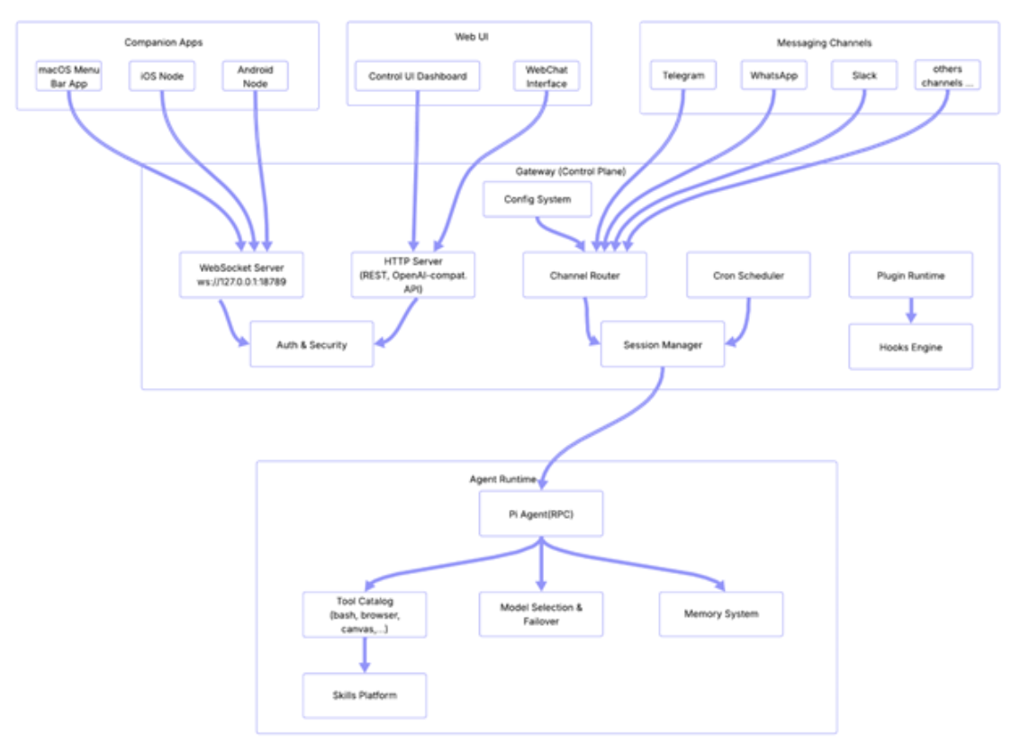 High level architecture can be grouped in 4 major sub-groups. “OpenClaw’s architecture can be understood as four layers, each with distinct responsibilities. The Messaging Channels layer handles user interaction. The Companion Apps and Web UI provide alternative interfaces. The Gateway layer orchestrates communication, authentication, and routing. And the Agent Runtime layer contains the AI brain. Together, they form a system that is modular, extensible, and, in the wrong hands, dangerously powerful.” Let’s do a deep dive.