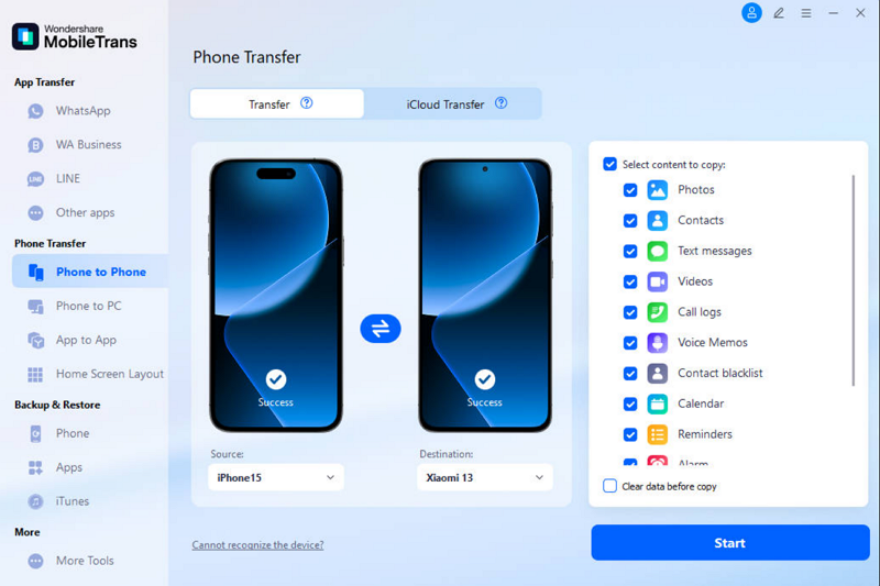 After accessing MobileTrans, connect both of your phones to the computer and choose the “Phone to Phone” tool. After that, select the files you want to move, then click the “Start” button to begin the transfer.