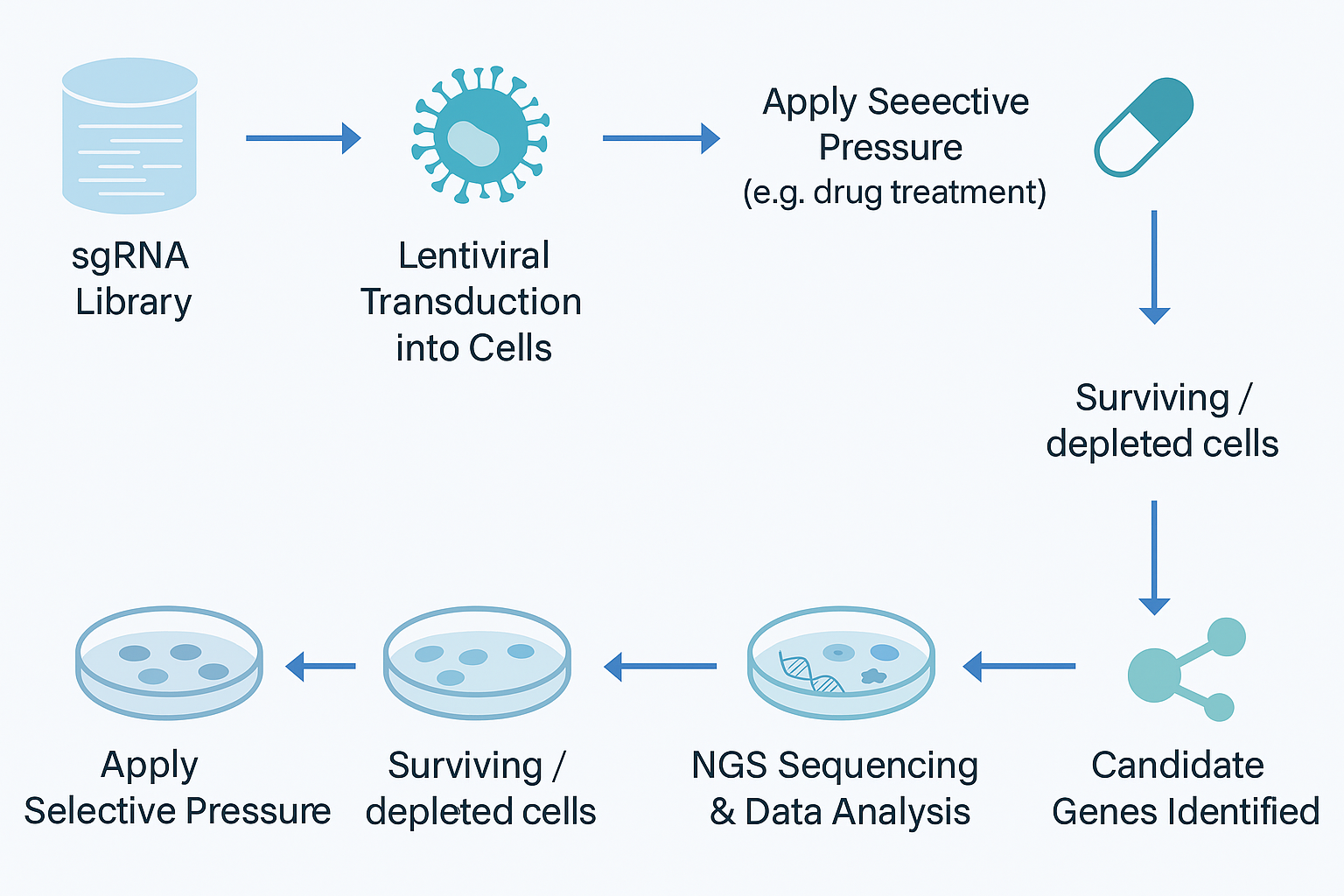 - Ensure sufficient coverage: Aim for 500–1000× coverage. A 20,000-sgRNA library means at least 10 million cells. Undercoverage causes dropout bias, where guides disappear not from biology but lack of representation.