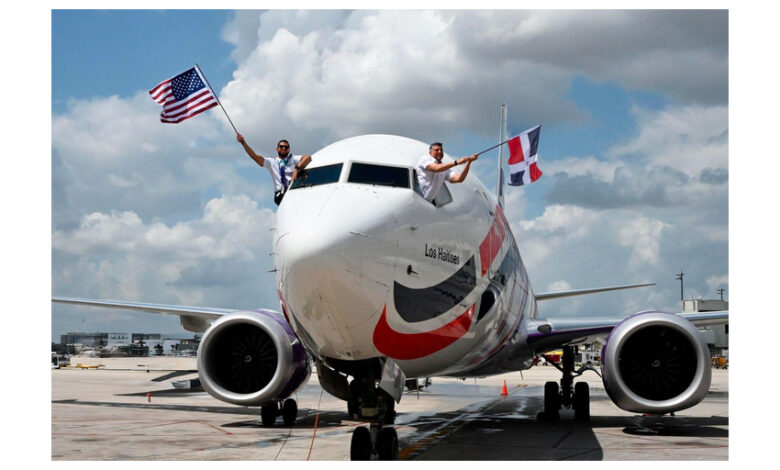 The Dominican airline landed at Miami International Airport with 189 passengers on a Boeing 737 Max 8 named Los Haitises, which features the national flag drawn along the aircraft’s fuselage.