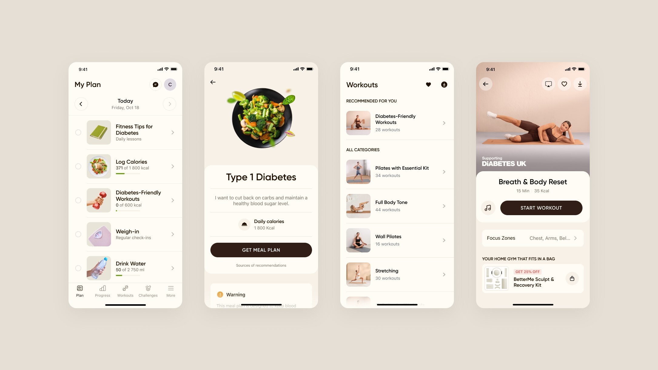 The programme features workouts that combine strength and cardio. These sessions focus on building strength, improving cardiovascular fitness, and supporting glucose management through safe, accessible movement. It also includes gentle recovery sessions, such as stretching and myofascial release, helping users support muscle recovery and maintain mobility.
