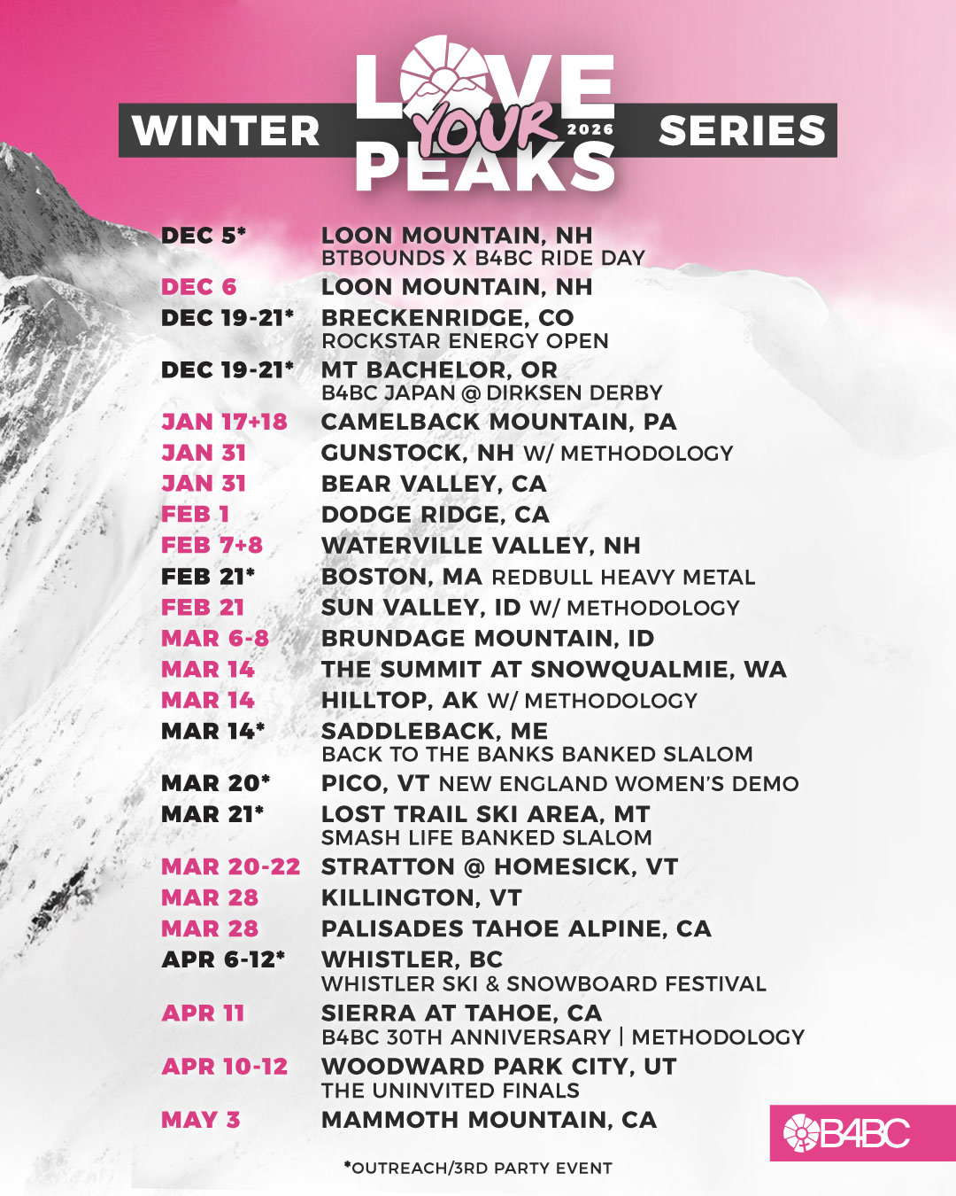 For those that can’t make it out to a Love Your Peaks stop, there will be additional opportunities to support B4BC this winter season. With deep roots in the action sports industry, B4BC will be spreading breast cancer prevention at some of the season’s most anticipated events. Attendees are encouraged to stop by, participate in breast health education, learn how they can champion breast cancer survivors and thrivers and spread the word of prevention!