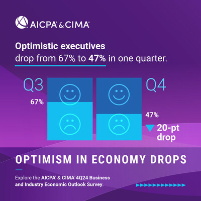 NEW YORK, March 6, 2025 /PRNewswire/ — A post-election boost in business executives’ optimism about the U.S. economy has moderated, declining from a more than three-year high of 67% last quarter to 47% this quarter, theย AICPA & CIMA Economic Outlook Survey found. The shift reflects growing concerns about inflation and tariffs, according to the survey, which polls chief executive officers, chief financial officers, controllers, and other certified public accountants in U.S. companies who hold executive and senior management accounting roles.