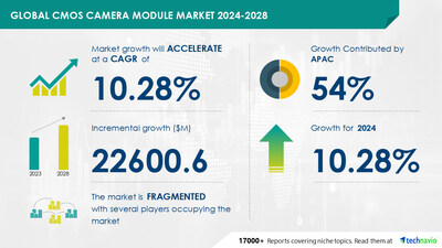NEW YORK, June 17, 2024 /PRNewswire/ — The globalย CMOs camera module market size is estimated to grow by USD 22.60ย billion from 2024-2028, according to Technavio. The market is estimated to grow at a CAGR of 10.28% during the forecast period. Growing popularity of social media applicationsย is driving market growth,ย with a trend towardsย technological advances in image sensors of CMOs camera module. However,ย accuracy issues poses a challenge. Key market players include Balluff GmbH, e-con Systems Inc., Huiber Vision Technology Co. Ltd., IDS Imaging Development Systems Gmbh, Jenoptik AG, LG Electronics Inc., Mcnex Co. Ltd., MISUMI Electronics Corp., Nikon Corp., NXP Semiconductors NV, OmniVision Technologies Inc., ON Semiconductor Corp., Panasonic Holdings Corp., PCE Holding GmbH, Samsung Electronics Co. Ltd., Sharp Corp., SK hynix Co. Ltd., Sony Group Corp., STMicroelectronics International N.V., and Teledyne Technologies Inc..