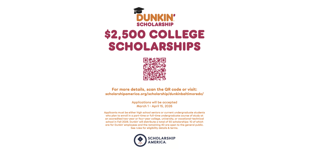Applications for the fifth annual Dunkin’ DMV Regional Scholarship Program will be accepted through April 15, 2026. Applicants must be either high school seniors or current undergraduate students who plan to enroll in a part-time or full-time undergraduate course of study at an accredited two-year or four-year college, university, or vocational-technical school in Fall 2026. Applicants must be a permanent resident in one of the regions below to be considered. For more information or to apply, visit https://scholarshipamerica.org/scholarship/dunkinbaltimoredc/