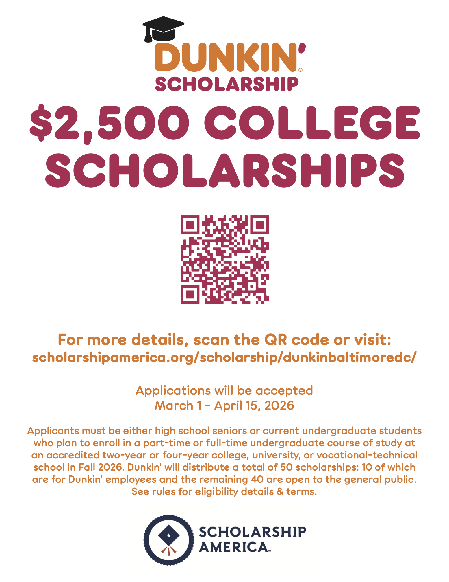 In collaboration with Scholarship America, Dunkin’ will award a $2,500 academic scholarship to 50 students throughout the DMV area to attend an accredited two- or four-year college, university, or vocational-technical school of their choice in Fall 2026. Dunkin’s DMV Regional Scholarship Program is open to high school seniors and current part-time and full-time undergraduate students. Recipients will be selected based on their academic record, demonstrated leadership skills, and overall commitment to their school and local community.