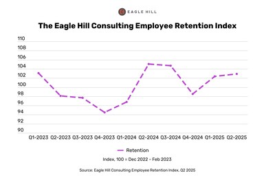 ARLINGTON, Va., July 24, 2025 /PRNewswire/ — The latest Eagle Hill Consulting Employee Retention Index continues an upward trend, rising by 0.4 points to 102.9, signaling that workers likely will remain in their jobs over the next six months. Importantly, the Retention Index measures a sharp decline in employees’ perceptions of the external job market. The Market Opportunity Indicator dropped by 4.4 points, the steepest decline since the Index’s inception in 2023 and now sitting at its lowest recorded level.