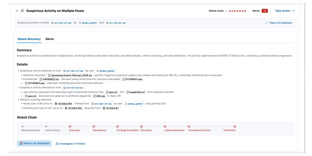 Many SOCs have 1000s of alerts to sift through daily. Much of this work is dull, time-intensive, and error-prone. Elastic Security removes the need for such manual effort. Attack Discovery triages out the false positives and maps the remaining strong signals to discrete attack chains, showing how related alerts are part of an attack chain. Attack Discovery uses LLMs to evaluate alerts, taking into consideration severity, risk scores, asset criticality and more. By delivering this accurate and fast triage, analysts can spend less time sifting through alerts and more time investigating and addressing threats.