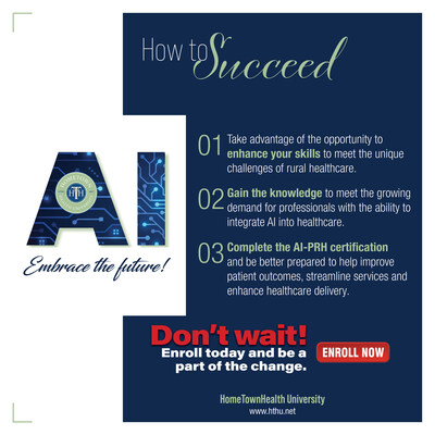 CUMMINGS, Ga., July 31, 2025 /PRNewswire/ — HomeTown Health University (HTHU) proudly announces the launch of its new “Artificial Intelligence Practitioner in Rural Health” (AI-PRH) certification program. This pioneering initiative equips professionals in rural healthcare with expertise, skills, and confidence to harness artificial intelligence (AI) for transforming patient care, enhancing operational efficiency, and positively impacting health outcomes.
