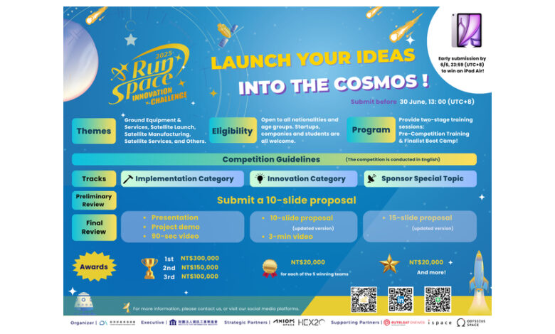 TAIPEI, Taiwan–(BUSINESS WIRE)–Are you ready to take your innovative space ideas to the next frontier? The 2025 RunSpace invites students, professionals, startups, and researchers from around the world to compete in one of the most exciting international space competitions. With generous cash prizes, certificates for participation, and access to global space industry leaders, this is your chance to help shape the future of space technology.