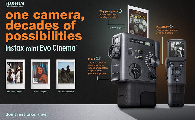 The mini Evo Cinema is a hybrid instant camera that not only lets users capture videos and turn them into instax™ prints, but also offers 10 “Eras Dial™” effects inspired by different eras, creating an experience that feels like stepping back in time. The promotional tagline “One camera, decades of possibilities” expresses our hope that users capture extraordinary, era-themed scenes as instax™ prints. The tagline is used online, on social media and at stores to communicate the appeal of the “mini Evo Cinema” to as many people as possible.