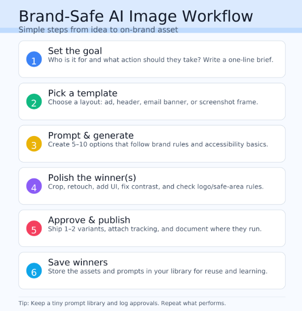 Keep humans in the loop. Use licensed inputs, avoid trademarks and famous faces, and do a quick bias check for people’s images. Log prompts, sources, and approvals so legal reviews are simple. When an image wins, note why (layout, color, headline) and reuse that pattern in future prompts.