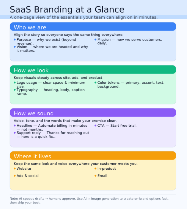 SaaS branding is what customers think and feel when they see your software, not just the logo on your site. It’s your values, mission, and promise – expressed through your name, voice, visuals, website, and the product experience itself. Done well, it makes your company easy to spot, easy to trust, and easy to choose in a crowded market.