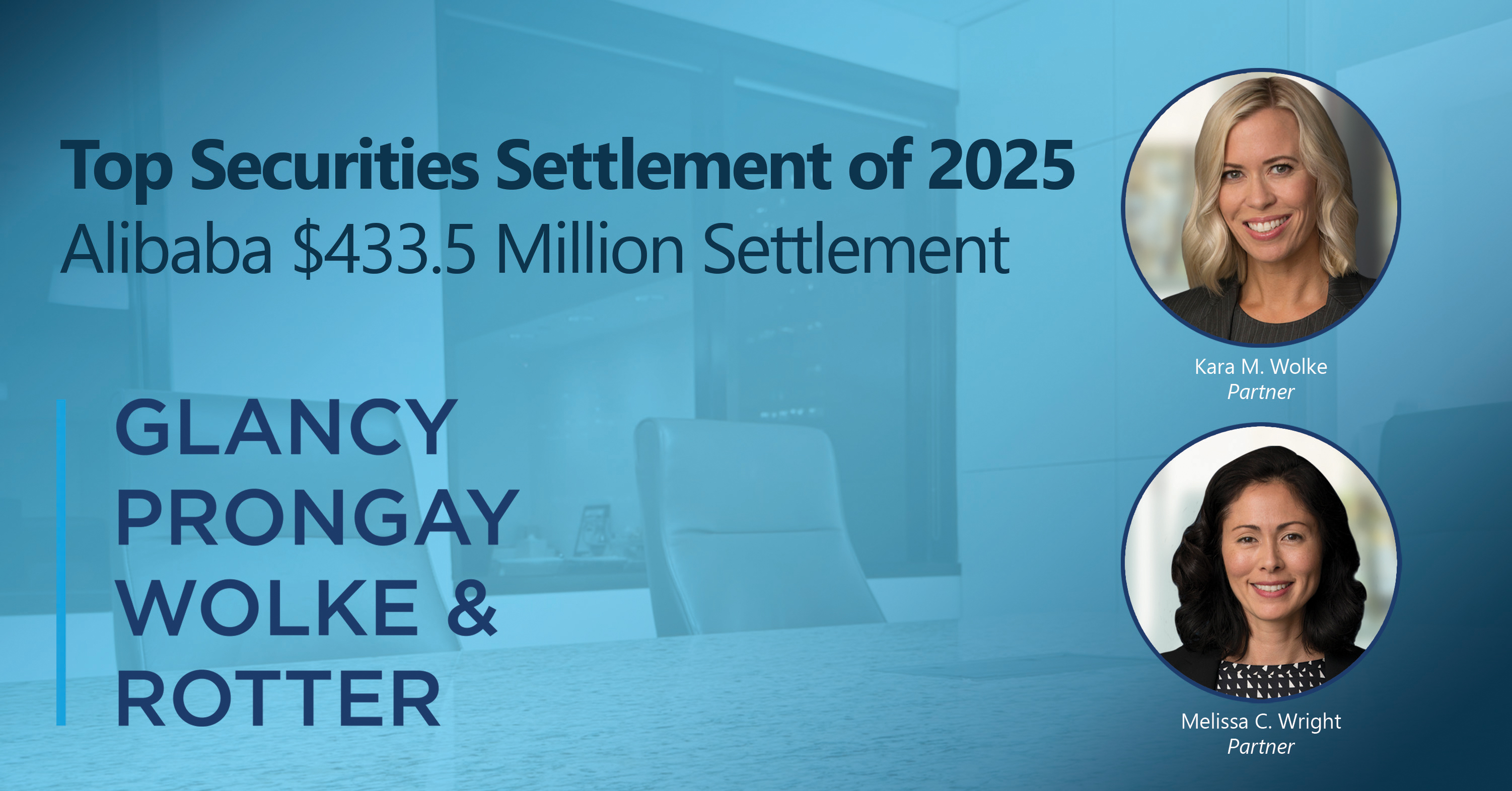 LOS ANGELES–(BUSINESS WIRE)–Glancy Prongay Wolke & Rotter LLP (GPWR) is proud to announce that the Firm, as sole lead counsel for Alibaba investors, attained the highest securities class action settlement of 2025, according to prominent national economic consulting firm, NERA. Spearheaded by partners Kara Wolke and Melissa Wright, GPWR leveraged its deep experience and tenacious advocacy into a $433.5 million settlement for the benefit of Alibaba’s investors. Injured by fraud or corporate wrongdoing? Let GPWR put its skills to work for you.