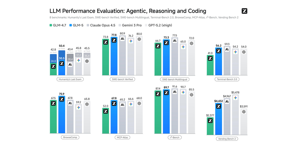 Benchmarks suggest strong gains. On SWE-bench-Verified and Terminal Bench 2.0, GLM-5 scores 77.8 and 56.2, respectively, the highest reported results for open-source models, surpassing Gemini 3 Pro in several software-engineering tasks. On Vending Bench 2, which simulates running a vending-machine business over a year, it finishes with a balance of $4,432, leading other open-source models in operational and economic management.