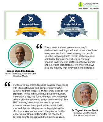 BENGALURU, India and SEATTLE and LONDON, Aug. 27, 2024 /PRNewswire/ — Happiest Minds Technologies Limited (NSE: HAPPSTMNDS), a ‘Born Digital . Born Agile’, Mindful IT Company, today announced that it has been honored with two prestigious accolades at the 17th Brandon Hall Group HCM Excellence Awards 2024. Happiest Minds won a Gold in Talent Acquisition for the ‘Best New Hire Onboarding Program’ – Data Engineering on Microsoft Azure and a Silver in Future of Work for the ‘Best Program for Upskilling Employees’ – Software Development Engineer in Test (SDET). These awards reinforce Happiest Minds’ position as a leader in the IT industry, particularly highlighted by its partnership with StackRoute โ an NIIT venture renowned for its excellence in tech education.
