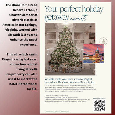 “Historic Hotels of America and Historic Hotels Worldwide are dedicated to preserving the authenticity of the finest iconic and legendary historic hotels, where hoteliers strive to create meaningful experiences for their guests,” said Lawrence P. Horwitz, Executive Vice President of Historic Hotels of America and Historic Hotels of America. “By partnering with StraxAR, we are providing a new technology that will provide travelers with a fantastic tool to bring history to life in an innovative, easy to use way that blends traditional historic experiences with modern technology.”