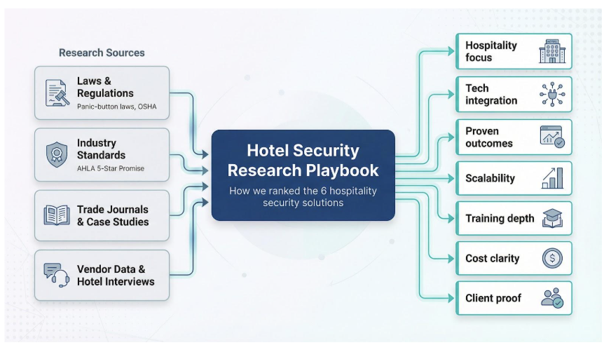 We began with the fine print of new panic-button laws, OSHA guidance, and AHLAโs 5-Star Promise to pin down todayโs compliance line. Next, we reviewed the top twenty โhotel securityโ search results to see where typical listicles miss the mark on tech, staff safety, and ROI. Those gaps shaped this guide.