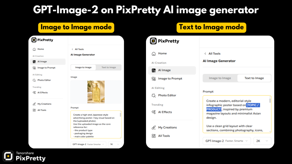 In addition, you can also use GPT Image 2 on PixPretty, allowing you to create images through PixPretty AI image generator online with a more design-focused interface.