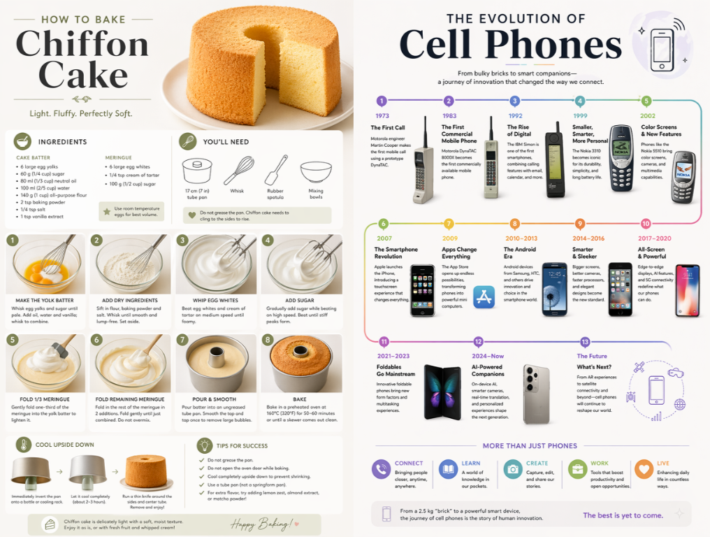 Its advanced text rendering and multilingual support make GPT Image 2.0 highly effective for infographic design, especially in terms of style, layout, and visual hierarchy. It performs particularly well for small text and structured layouts, making it ideal for recipes, textbooks, step-by-step tutorials, timelines, dashboards, and more.