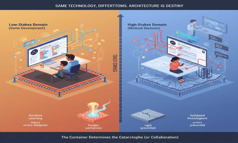 But this framework is incomplete without an architectural layer that accounts forย stakes-dependent requirements. The same technology that successfully multiplies human capital in game development fails catastrophically in medical diagnosis,ย not because of insufficient capability but because of architectural mismatch with epistemological requirements.ย