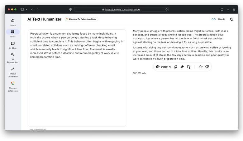 By combining with JustDone’s AI Detector, the Humanizer offers a complete workflow for content creators: generate text, check it, and make it human-like. This makes it especially valuable for those who want reliable, authentic results without worrying about detection or loss of meaning.