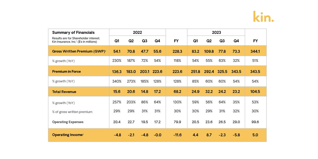 CHICAGO–(BUSINESS WIRE)–Kin, the pioneering digital, direct-to-consumer home insurance company, today announced operating results through the fourth quarter ended December 31, 2023.