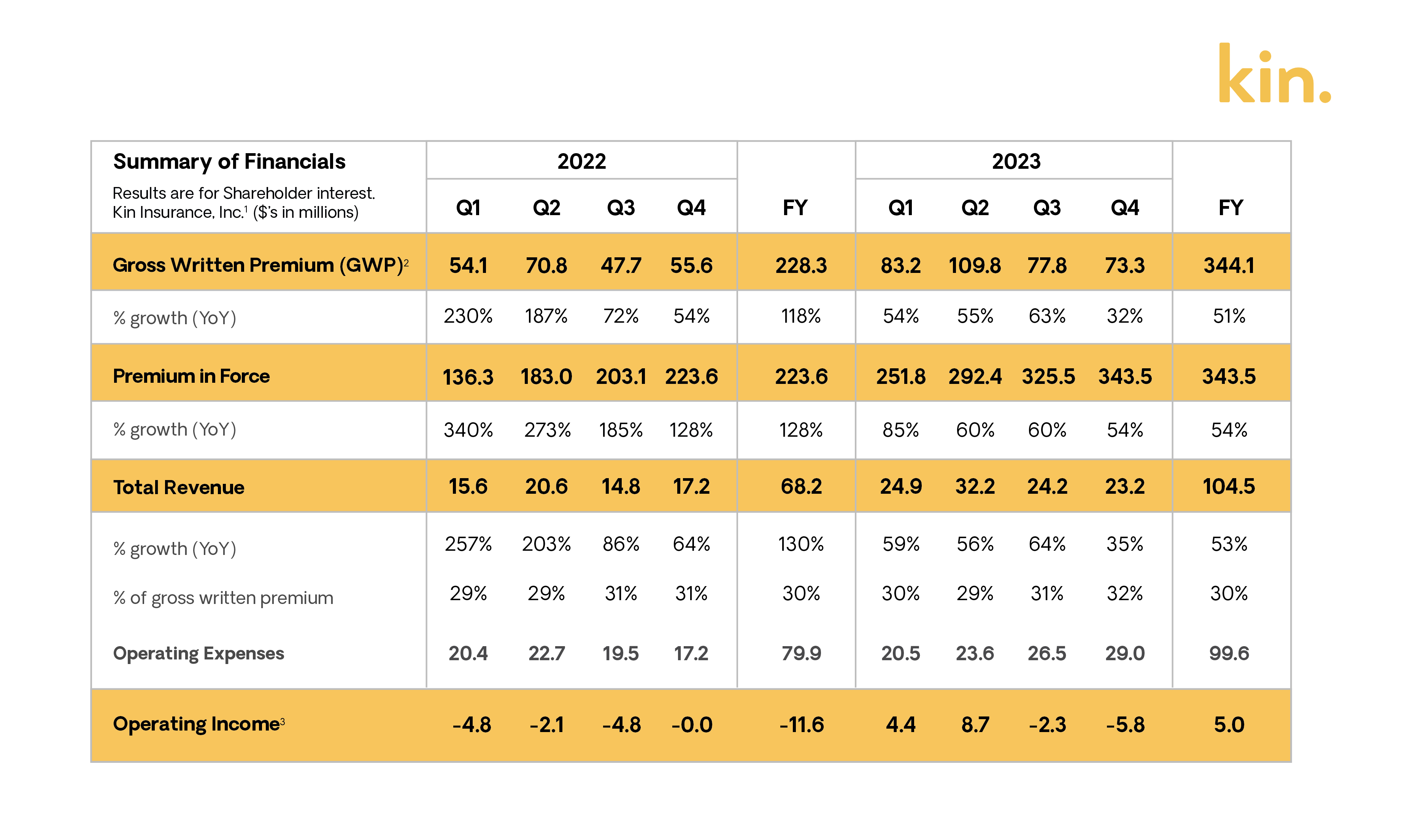 CHICAGO–(BUSINESS WIRE)–Kin, the pioneering digital, direct-to-consumer home insurance company, today announced operating results through the fourth quarter ended December 31, 2023.
