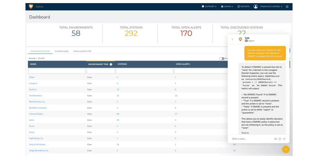 Leo now delivers instant answers to commonly asked questions across all Liongard digital platforms, including share.liongard.com —a user-driven repository of essential metrics, Liongard’s comprehensive documentation site, and liongard.com.