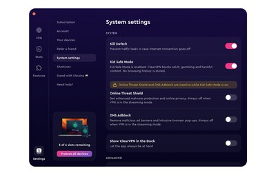 Kid Safe Mode is a powerful addition to ClearVPN’s existing security features, including DNS Adblock, which protects against malicious apps and intrusive pop-ups, and Online Threat Shield, which blocks malicious domains and helps defend users from scams, phishing, cryptojacking, and other cyber threats.