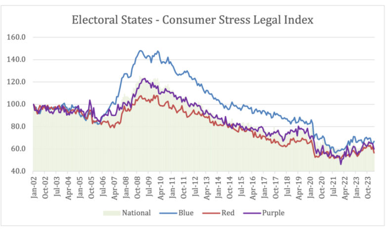 โThe trend suggests that when โswing stateโ consumer stress, as measured by more than 150,000 consumer legal inquiries we field each month, dips below national stress average in October and November, conditions favor a Democratic win,โ said Matt Layton, LegalShield senior vice president of consumer analytics. โThatโs where we are now; weโll be watching this relationship closely.โ
