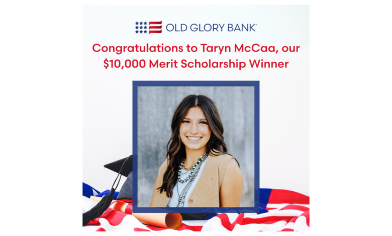 ELMORE CITY, Okla.–(BUSINESS WIRE)–Old Glory Bank is proud to announce the recipient of its inaugural Old Glory Bank Merit Scholarship. The one-time, $10,000 award recognizes a rising college freshman who has demonstrated the outstanding values the Bank holds in the highest regard – patriotism, commitment to excellence, integrity, discipline, and service.