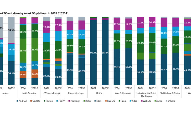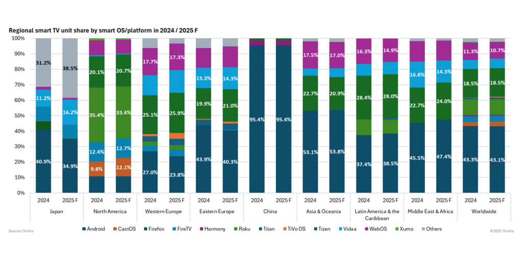 LONDON–(BUSINESS WIRE)–#Amazon–New data from Omdia has revealed notable momentum for two key TV operating system platforms in the North American TV Sets market during 1Q25. Vizio CastOS showed significant growth shipping 1.2 million units, an increase of 40.4% year-over-year (YoY). In parallel, Amazon FireTV sets increased by 21.5% year YoY to reach 1.2 million units. Overall North American TV set shipments reached 9.8 million units, representing a modest 0.55% YoY growth. Globally, TV set shipments increased by 2.4% YoY to 47.5 million units, with Latin America showing the fastest growth rate (up 9.17% YoY), followed by China (up 3.25% YoY).