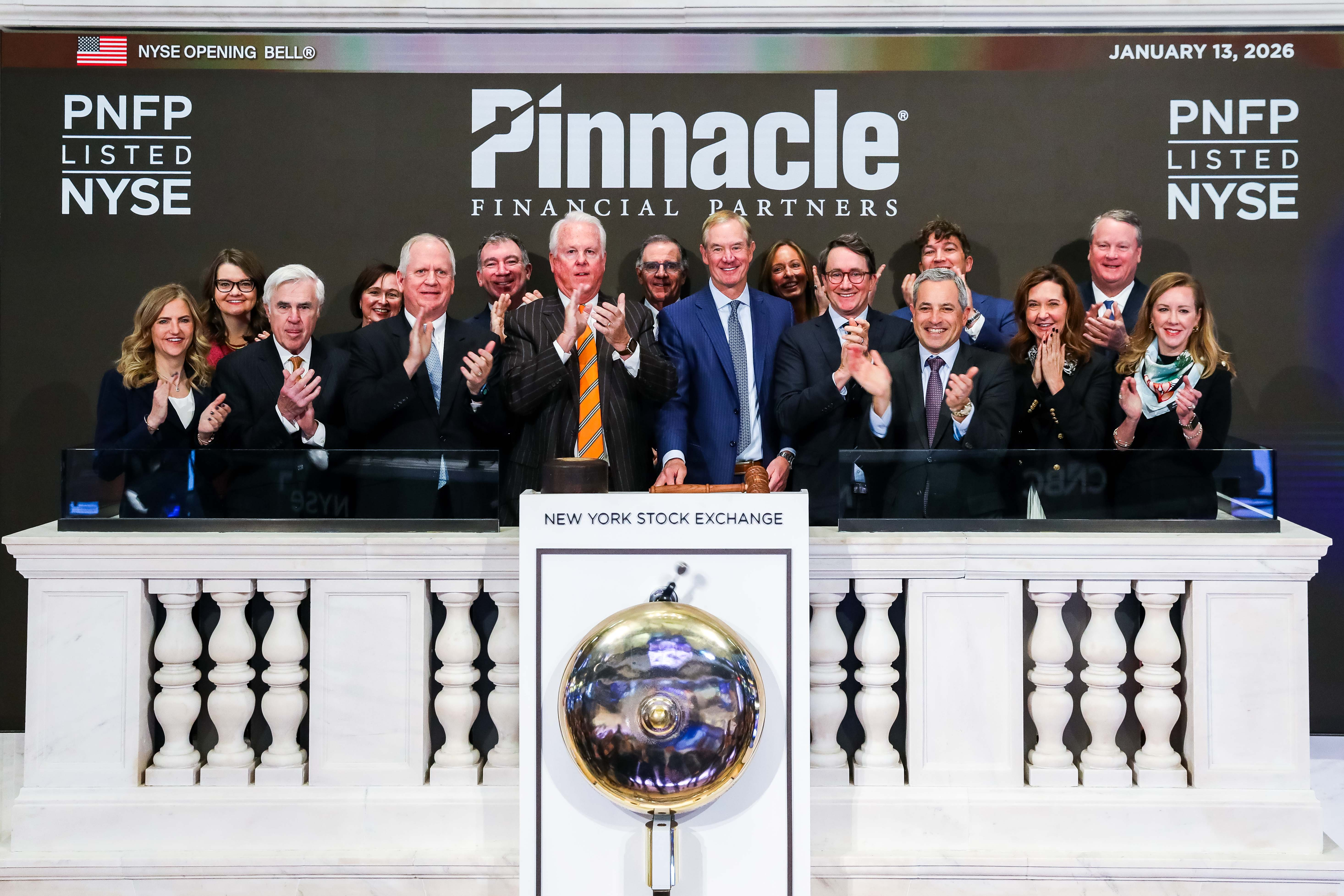 NEW YORK–(BUSINESS WIRE)–$PNFP–Pinnacle Financial Partners (NYSE: PNFP) President and CEO Kevin Blair rang the New York Stock Exchange opening bell Tuesday with his executive leadership team, Pinnacle Founder and Board Chair Terry Turner and former Pinnacle CFO Harold Carpenter. The event marks the closing of the firm’s merger with Synovus Financial Corp. and its new NYSE listing.
