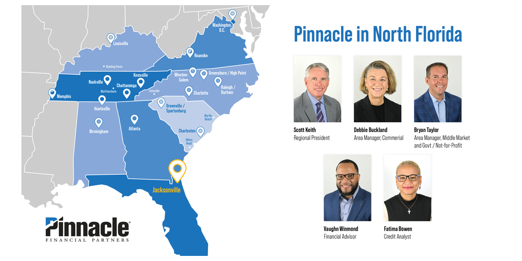 JACKSONVILLE, Fla.–(BUSINESS WIRE)–Pinnacle Financial Partners has entered the North Florida region with the addition of five veteran financial services professionals to build the firmโs presence from their homebase in Jacksonville. Scott Keith will serve as Pinnacleโs regional president for North Florida, with Debbie Buckland and Bryan Taylor by his side as area managers. Financial Advisor Vaughn Winmond and Credit Analyst Fatima Bowen round out the initial team, which is expected to grow rapidly as more associates come on board to offer a full suite of financial services for business and personal needs.