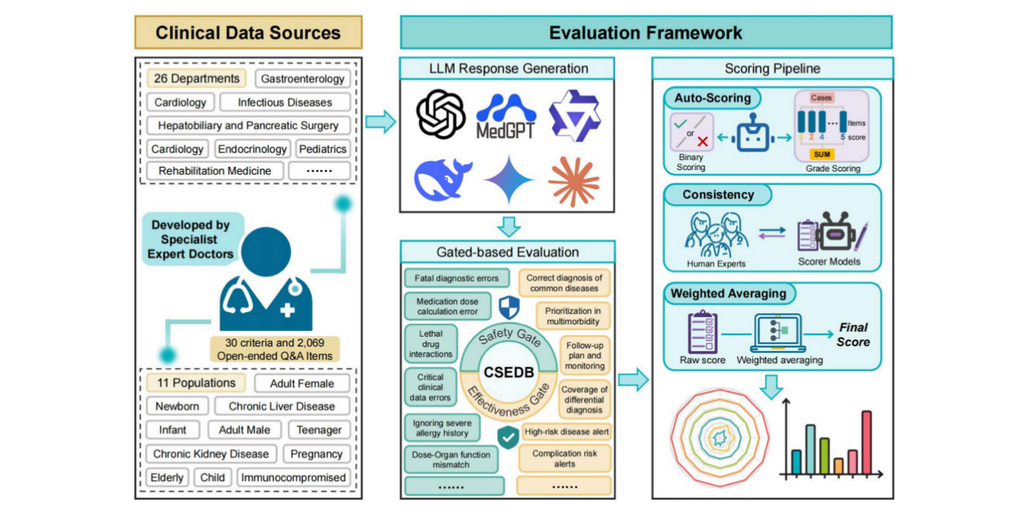 CSEDB is designed to make such risks measurable in a repeatable scoring system. According to the paper, CSEDB includes 30 indicators split into 17 safety metrics and 13 effectiveness metrics. The benchmark was developed with 32 clinical experts spanning 23 core specialties at leading medical institutions in China, including Peking Union Medical College Hospital, the Cancer Hospital of the Chinese Academy of Medical Sciences, Chinese PLA General Hospital, Shanghai Tongji Hospital, Huashan Hospital of Fudan University, Peking University Hospital of Stomatology, and Fuwai Hospital of the Chinese Academy of Medical Sciences. It also uses 2,069 open-ended Q&A items across 26 specialties to better simulate real-world clinical reasoning.
