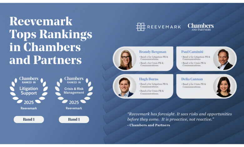 NEW YORK–(BUSINESS WIRE)–Strategic communications firm Reevemark LLC today announced that it has been recognized by Chambers and Partners (“Chambers”) with its highest Band One rankings in the 2025 Litigation PR & Communications Guide and Crisis PR & Communications Guide. Reevemark maintained its Band One position in Litigation Communications and earned enhanced recognition by moving into Band One for Crisis Communications for the first time. In addition, four of Reevemark’s Founding Partners, Brandy Bergman, Paul Caminiti, Hugh Burns, and Delia Cannan, received individual recognition for their expertise.