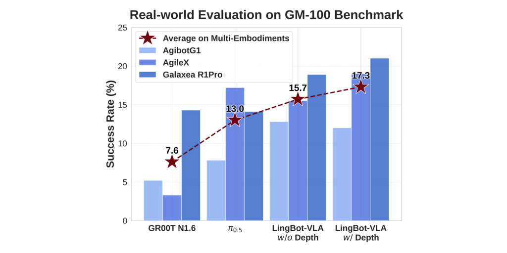 The model’s performance was evaluated on the GM-100 benchmark, a comprehensive evaluation suite open-sourced by Shanghai Jiao Tong University that comprises 100 real-world tasks. In tests conducted across three distinct physical robot platforms, LingBot-VLA achieved higher task success rates than other evaluated models. Notably, when depth information was included, the model’s spatial perception improved significantly, setting a new record on task success rate.