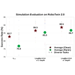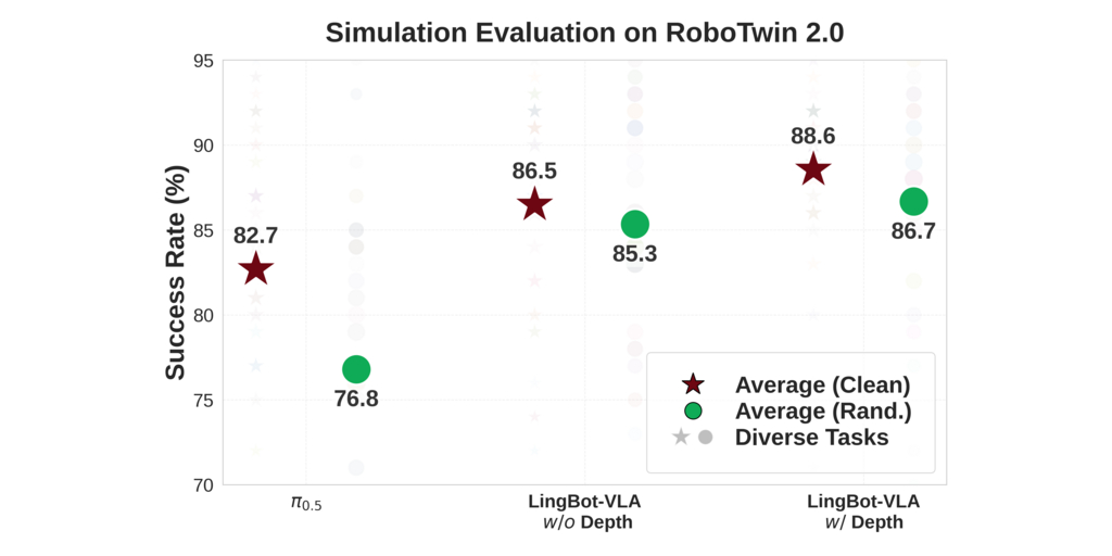 Additionally, on the RoboTwin 2.0 simulation benchmark, which features 50 challenging tasks under intense environmental randomization, including varying lighting, clutter, and height perturbations, LingBot-VLA leveraged its learnable query alignment mechanism to integrate depth cues effectively and achieved a higher task success rate in complex scenarios, demonstrating robust performance on both simulation and real-world deployment.