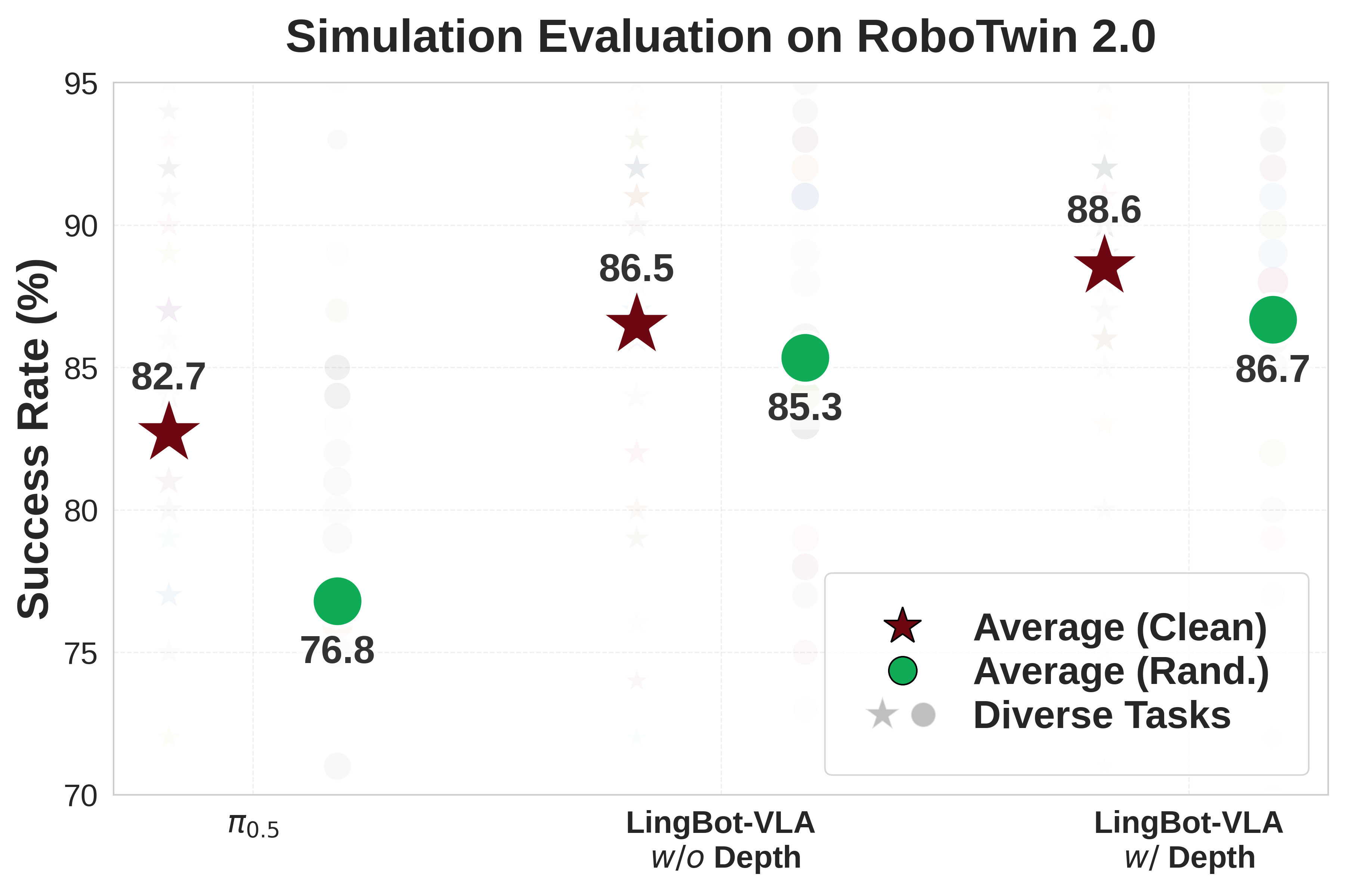 Additionally, on the RoboTwin 2.0 simulation benchmark, which features 50 challenging tasks under intense environmental randomization, including varying lighting, clutter, and height perturbations, LingBot-VLA leveraged its learnable query alignment mechanism to integrate depth cues effectively and achieved a higher task success rate in complex scenarios, demonstrating robust performance on both simulation and real-world deployment.