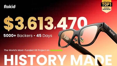 NEW YORK, Oct. 10, 2025 /PRNewswire/ — Rokid, a pioneer in human-computer interaction and augmented reality, today announced the successful completion of its Kickstarter campaign for Rokid Glasses, raising an extraordinary $3,613,470 from over 5,000 backers in 45 days. This achievement ranks Rokid among the highest-funded wearable technology projects in Kickstarter history and establishes a new global record for XR (Mixed Reality) campaigns.