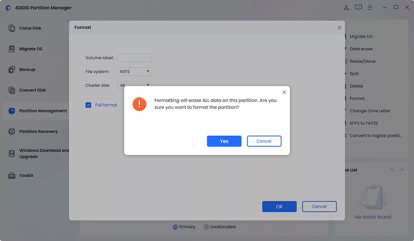 2. Create the new partition with details like “Label”, “File System”, etc., with 4DDiG so it will delete the old partition and click “OK” then “Yes”.