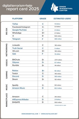 NEW YORK and LOS ANGELES, April 29, 2025 /PRNewswire/ — The Simon Wiesenthal Center (SWC), a leading global Jewish human rights organization, today released its 2025 Digital Terror and Hate Report Card at a press conference with the New York City Council and, simultaneously, in a presentation to the California State Legislature. The report card measures and documents the failure of leading social media companies to adequately address the growing climate of hate rhetoric online.