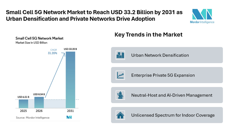 According to Mordor Intelligence, the small cell 5G network market size is expected to grow from USD 6.51 billion in 2025 to USD 8.54 billion in 2026 and is forecast to reach USD 33.2 billion by 2031, registering a CAGR of 31.2% during the forecast period. Rising data consumption, demand for low-latency connectivity, and the need to extend coverage in dense urban zones are central to this outlook. These factors are shaping the market size and creating new deployment opportunities across indoor venues, transportation hubs, campuses, and smart-city corridors.