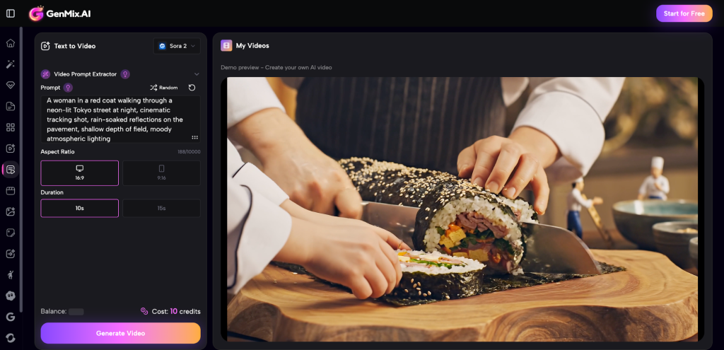 GenMix AI solves this by aggregating 20+ AI models โ including Sora 2, Veo 3, and Kling 2.6 โ into a single unified interface. Write your prompt once, then switch between models with one click. Your settings, generation history, and credit balance carry over between every model in the platform.