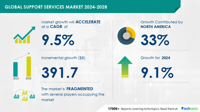 NEW YORK, Oct. 28, 2024 /PRNewswire/ — Report with the AI impact on market trends – The Global Support Services Market size is estimated to grow by USD 391.7 billion from 2024-2028, according to Technavio. The market is estimated to grow at a CAGR of 9.5% during the forecast period. Increasing demand for support services from aviation industryย is driving market growth,ย with a trend towardsย rising adoption of AI models in support services. However,ย instances of technological disruptions in operation of support services poses a challenge.Key market players include ABB Ltd., Apple Inc., Broadcom Inc., Cisco Systems Inc., Dell Technologies Inc., FUJIFILM Corp., HCL Technologies Ltd., Infosys Ltd., Integra Global Solutions Corp, International Business Machines Corp., Lenovo Group Ltd., Markel Corp., Microsoft Corp., myairops, Panasonic Holdings Corp., Quatrro Inc., S and P Global Inc., Samsung Electronics Co. Ltd., SAP SE, Toshiba Corp., Wipro Ltd., and Zenoti.