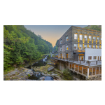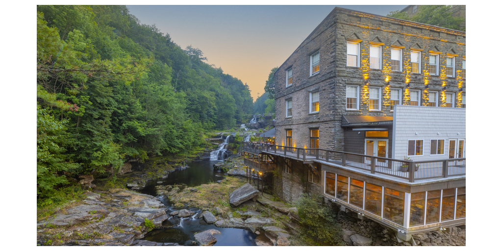 Perched on the edge of Wallenpaupack Creek in Hawley, Pennsylvania, amid the breathtaking scenery of the Pocono Mountains, Ledges Hotel is a tranquil destination with a fascinating industrial history. The five-story Federal-style building dates to the 1890s, when it served as the J.S. O’Connor American Rich Cut Glassware Factory, one of the largest of its kind in the United States at the time. Founded by an Irish immigrant, the factory on Wallenpaupack Creek was water-powered, and one of the county’s biggest employers. In 2011, family-owned Settlers Hospitality Group acquired the building to develop a hotel and restaurant that would preserve the aesthetic of this historic building, constructed with Pennsylvania Bluestone. Wood from the trusses of the adjacent Bellemonte Silk Mill was repurposed into modern beds and tables for guestrooms. Décor in the hotel’s restaurant, Glass, includes original glass mold prints from the factory, as well as historic images from its factory era. Wood from a fallen 250-year-old copper beech tree was used to create a live edge bar and tabletops for the dining room. A part of the hotel known as “the ruins” was converted into an outdoor lounge space. This area is a guest favorite, and allows visitors to see a portion of the original factory building, where the architecture blends seamlessly with the surrounding natural rock ledges and waterfall. Merging modern design and amenities with historical integrity and environmental sustainability, Ledges Hotel was inducted into Historic Hotels of America in 2013.